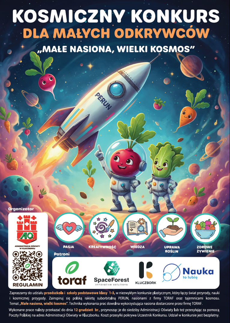 Szanowni Państwo z przyjemnością ogłaszamy Konkurs plastyczny dla przedszkoli i uczniów klas I-III , pn. MAŁE NASIONA-WIELKI KOSMOS, którego organizatorem jest Administracja Oświaty w Kluczborku, a Parterami Konkursu są: PN TORAF SP Z O.O. W MACIEJOWIE, SPACEFOREST SP Z.O.O. Z GDYNI ORAZ FUNDACJA NAUKA TO LUBIĘ Z GLIWIC.