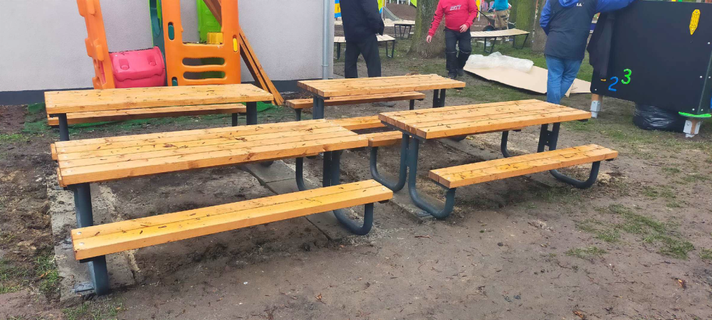 6) zakup i montaż elementów ogrodowych ( zakup ławeczek i stołów oraz parasoli ogrodowych zapewniających cień)