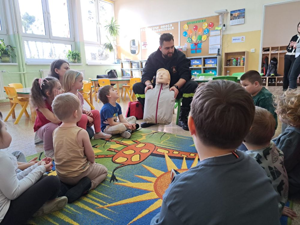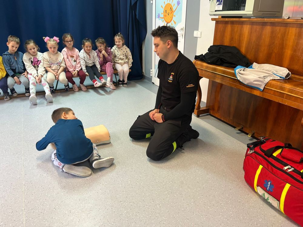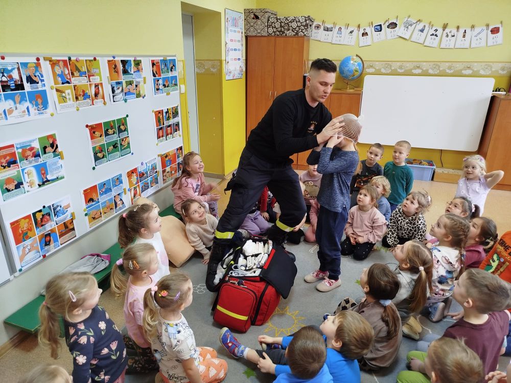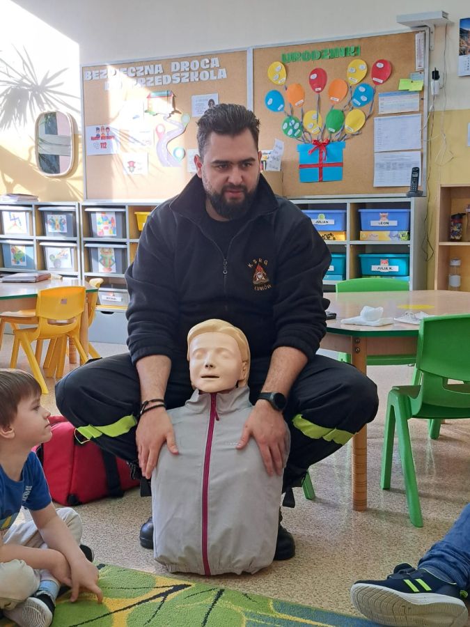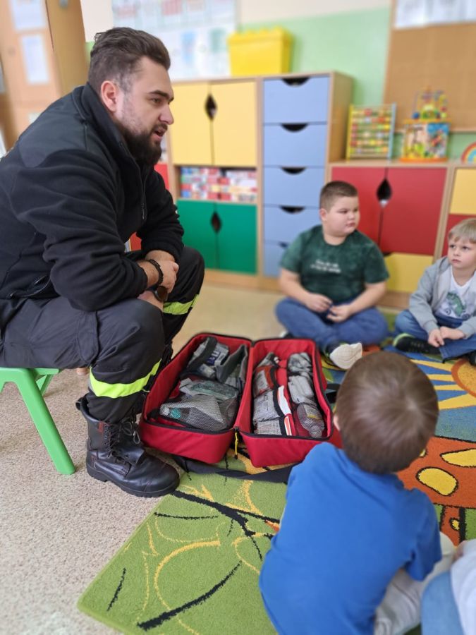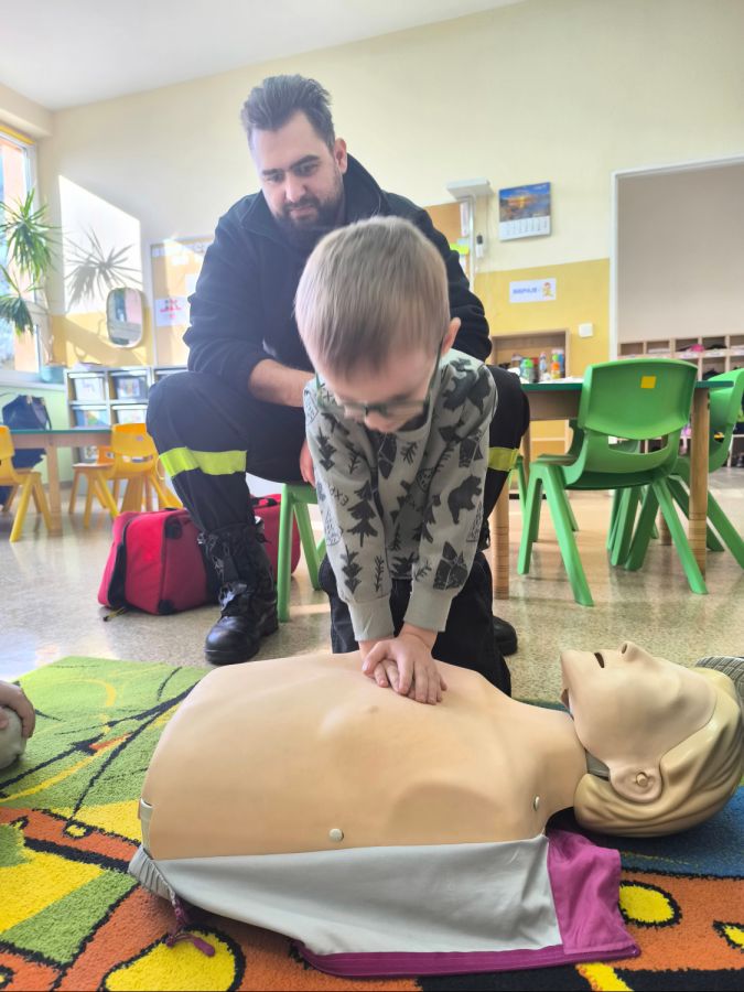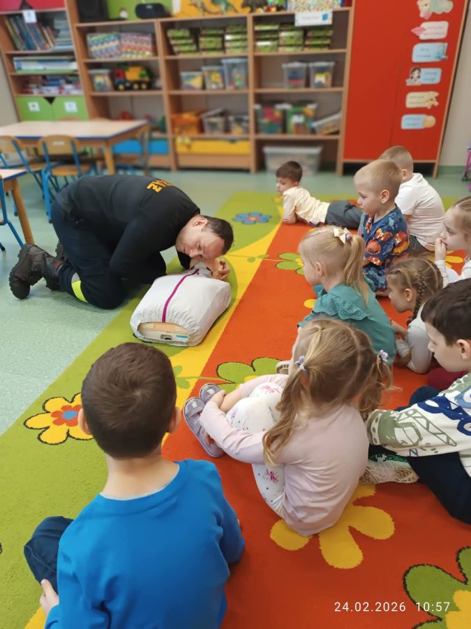 Kolejnym zadaniem realizowanym w XII.2025r. - II 2026r, była pierwsza pomoc przedmedyczna. Jednostka Ochotniczej Straży Pożarnej w Kuniowie jako partner projektu odpowiedzialna jest za realizację zadania nr 10. Strażacy przeprowadzili szkolenia z pierwszej pomocy przedmedycznej dla dzieci. Zapoznanie z zasadami powiadamiania- jak należy formułować komunikat, jaki jest numer ratunkowy, zapoznanie z sytuacjami, w jakich ich pomoc może być niezbędna- to tylko niektóre aspekty zajęć. Zarówno dziewczynki jak i chłopcy rozwijali podczas zajęć swoje zainteresowania, bowiem w treściach przedmiotowych unika się stereotypowego przypisywania określonych ról w ratownictwie danej płci. Podczas zajęć zostały uwzględnione zindywidualizowane potrzeby dzieci z niepełnosprawnościami. Zajęcia prowadzone przez członków OSP 2h/ grupę. Zajęcia zostały zorganizowane w styczniu i lutym 2026r. we wszystkich przedszkolach i oddziałach przedszkolnych przy szkołach podstawowych biorących udział w projekcie : Publiczne Przedszkole nr 1 w Kluczborku – 2 grupy (12K,12M); 2. Publiczne Przedszkole nr 2 z OI w Kluczborku – 2 grupy (14K,16M); 3. Publiczne Przedszklole nr 7 z OŻ w Kluczborku –2 grupy (11K,13M); 4. Publiczne Przedszkole nr 5 w Kluczborku – 2 grupy 18K,12M); 5. Publiczne Przedszkole nr 8 w Kluczborku 2 grupy (12K,12M); 6. Publiczne Przedszkole w Bogacicy – 2 grupy 912K,13M); 7. Oddziały przedszkolne przy PSP w Kuniowie – 1 grupa (7K,8M);8. Oddziały przedszkolne przy PSP w Bąkowie – 1 grupa (6K,6M); 9. Oddziały przedszkolne przy PSP w Kujakowicach Dolnych – 1 grupa (7K,8M).
