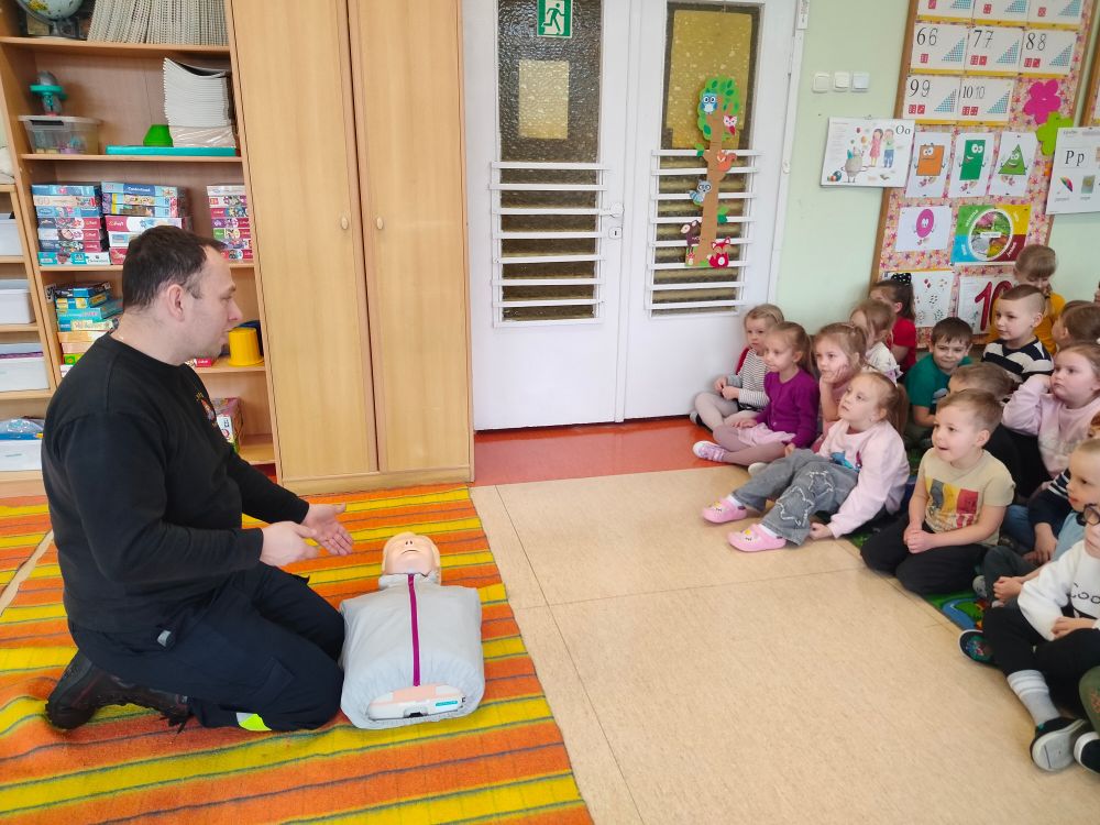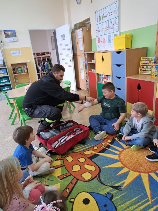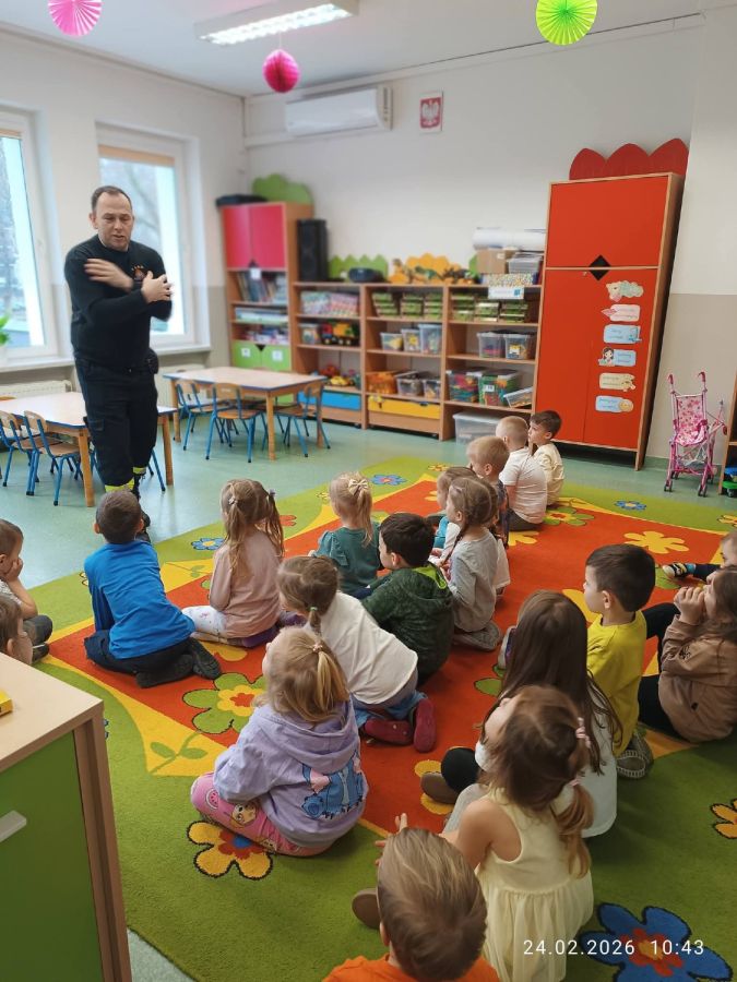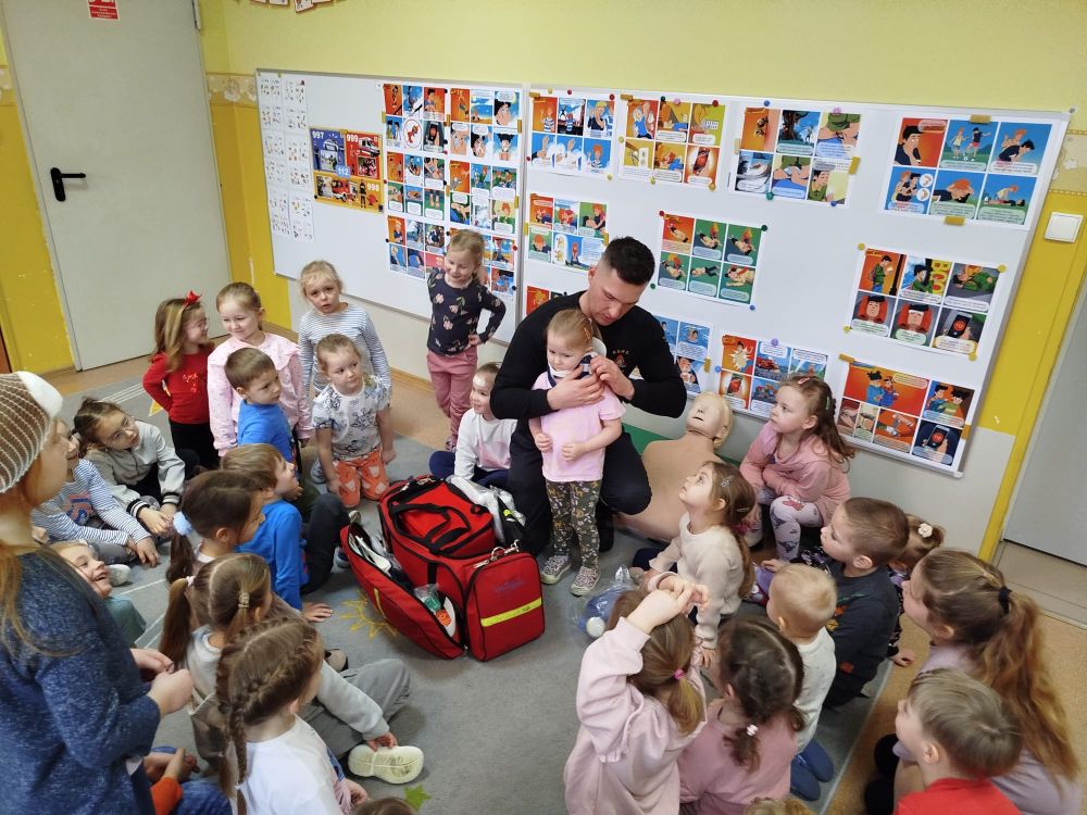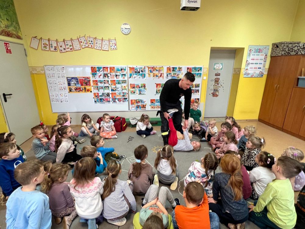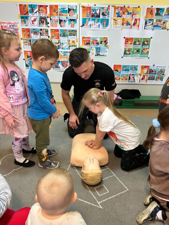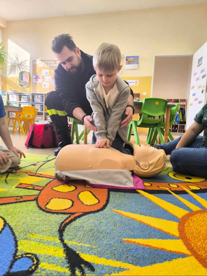 Kolejnym zadaniem realizowanym w XII.2025r. - II 2026r, była pierwsza pomoc przedmedyczna. Jednostka Ochotniczej Straży Pożarnej w Kuniowie jako partner projektu odpowiedzialna jest za realizację zadania nr 10. Strażacy przeprowadzili szkolenia z pierwszej pomocy przedmedycznej dla dzieci. Zapoznanie z zasadami powiadamiania- jak należy formułować komunikat, jaki jest numer ratunkowy, zapoznanie z sytuacjami, w jakich ich pomoc może być niezbędna- to tylko niektóre aspekty zajęć. Zarówno dziewczynki jak i chłopcy rozwijali podczas zajęć swoje zainteresowania, bowiem w treściach przedmiotowych unika się stereotypowego przypisywania określonych ról w ratownictwie danej płci. Podczas zajęć zostały uwzględnione zindywidualizowane potrzeby dzieci z niepełnosprawnościami. Zajęcia prowadzone przez członków OSP 2h/ grupę. Zajęcia zostały zorganizowane w styczniu i lutym 2026r. we wszystkich przedszkolach i oddziałach przedszkolnych przy szkołach podstawowych biorących udział w projekcie : Publiczne Przedszkole nr 1 w Kluczborku – 2 grupy (12K,12M); 2. Publiczne Przedszkole nr 2 z OI w Kluczborku – 2 grupy (14K,16M); 3. Publiczne Przedszklole nr 7 z OŻ w Kluczborku –2 grupy (11K,13M); 4. Publiczne Przedszkole nr 5 w Kluczborku – 2 grupy 18K,12M); 5. Publiczne Przedszkole nr 8 w Kluczborku 2 grupy (12K,12M); 6. Publiczne Przedszkole w Bogacicy – 2 grupy 912K,13M); 7. Oddziały przedszkolne przy PSP w Kuniowie – 1 grupa (7K,8M);8. Oddziały przedszkolne przy PSP w Bąkowie – 1 grupa (6K,6M); 9. Oddziały przedszkolne przy PSP w Kujakowicach Dolnych – 1 grupa (7K,8M).
