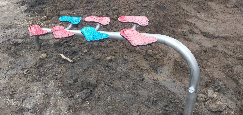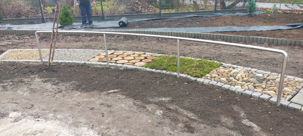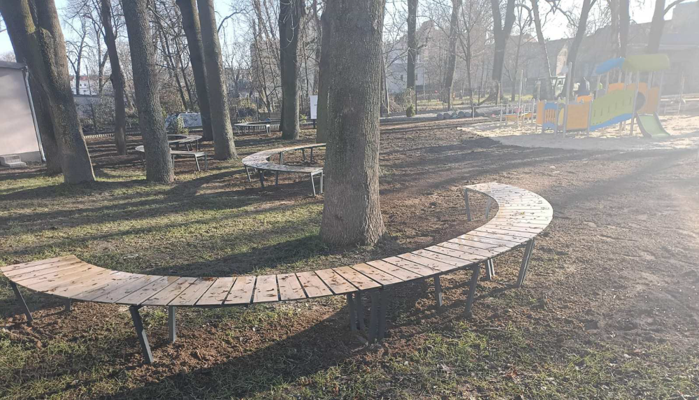 3) modyfikację i zagospodarowanie terenu ( zmiana ukształtowania terenu poprzez usypanie wzniesienia, utworzenie ścieżki sensorycznej łukowej , powstanie nowych ławek łukowych wokół drzew, obsadzenie nowymi krzewami i drzewami)