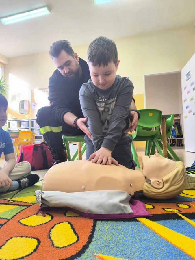 Kolejnym zadaniem realizowanym w XII.2025r. - II 2026r, była pierwsza pomoc przedmedyczna. Jednostka Ochotniczej Straży Pożarnej w Kuniowie jako partner projektu odpowiedzialna jest za realizację zadania nr 10. Strażacy przeprowadzili szkolenia z pierwszej pomocy przedmedycznej dla dzieci. Zapoznanie z zasadami powiadamiania- jak należy formułować komunikat, jaki jest numer ratunkowy, zapoznanie z sytuacjami, w jakich ich pomoc może być niezbędna- to tylko niektóre aspekty zajęć. Zarówno dziewczynki jak i chłopcy rozwijali podczas zajęć swoje zainteresowania, bowiem w treściach przedmiotowych unika się stereotypowego przypisywania określonych ról w ratownictwie danej płci. Podczas zajęć zostały uwzględnione zindywidualizowane potrzeby dzieci z niepełnosprawnościami. Zajęcia prowadzone przez członków OSP 2h/ grupę. Zajęcia zostały zorganizowane w styczniu i lutym 2026r. we wszystkich przedszkolach i oddziałach przedszkolnych przy szkołach podstawowych biorących udział w projekcie : Publiczne Przedszkole nr 1 w Kluczborku – 2 grupy (12K,12M); 2. Publiczne Przedszkole nr 2 z OI w Kluczborku – 2 grupy (14K,16M); 3. Publiczne Przedszklole nr 7 z OŻ w Kluczborku –2 grupy (11K,13M); 4. Publiczne Przedszkole nr 5 w Kluczborku – 2 grupy 18K,12M); 5. Publiczne Przedszkole nr 8 w Kluczborku 2 grupy (12K,12M); 6. Publiczne Przedszkole w Bogacicy – 2 grupy 912K,13M); 7. Oddziały przedszkolne przy PSP w Kuniowie – 1 grupa (7K,8M);8. Oddziały przedszkolne przy PSP w Bąkowie – 1 grupa (6K,6M); 9. Oddziały przedszkolne przy PSP w Kujakowicach Dolnych – 1 grupa (7K,8M).
